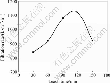 根据图9和10可以看出:温度对高硅氧化锌矿浸出过程的影响较为明显,低于120℃时矿物中大量可溶性的硅进入溶液,使矿浆过滤性能大幅度下降,特别是当浸出温度为100 ℃时,矿浆过滤速率仅为20 L/(m2?h),因此,高硅氧化锌矿加压酸浸的温度至少在120 ℃以上。