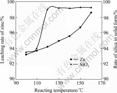 在硫酸浓度120 g/L、压力1.0 MPa、时间90 min的条件下进行反应温度对高硅氧化锌矿浸出效果的影响试验,结果如图9和10所示。