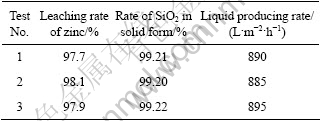 根据最佳工艺技术条件:矿物颗粒平均粒径0.104 mm、硫酸浓度120 g/L、压力1.0 MPa、时间90 min、温度120 ℃、液固比3?1,开展了3组综合性试验,结果如表2所列。