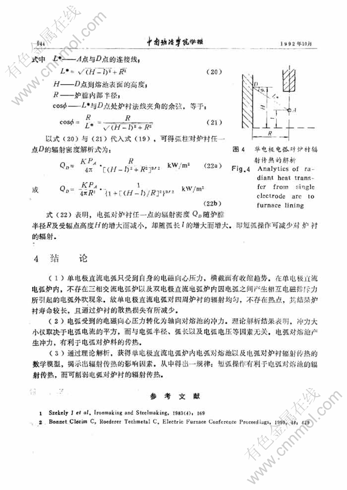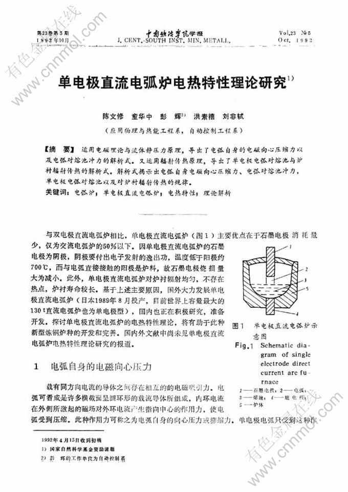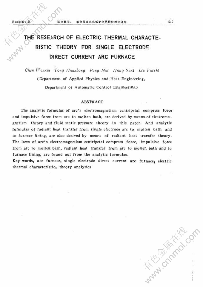 Key words:arc furnace; single electrode direct current arc furnace; electric thermal characteristic; theory analytics
