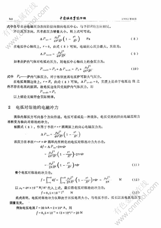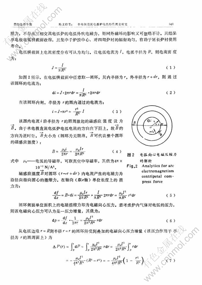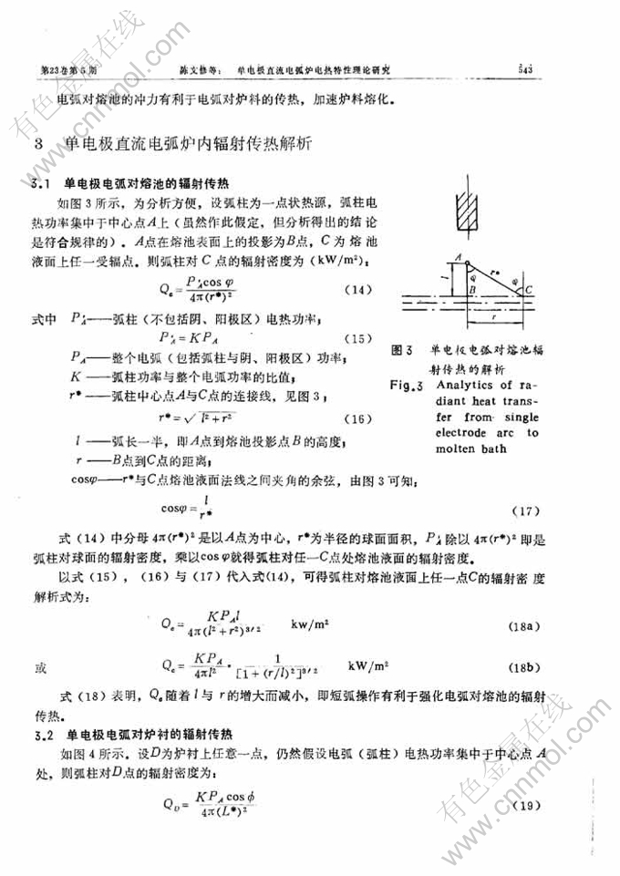 摘 要:运用电磁理论与流体静压力原理,导出了电弧自身的电磁向心压缩力以及电弧对熔池冲力的解析式。又运用辐射传热原理,导出了单电极电弧对熔池与炉衬辐射传热的解析式。解析式揭示出电弧自身电磁向心压缩力、电弧对熔池冲力,单电极电弧对熔池以及对炉衬辐射传热的规律。