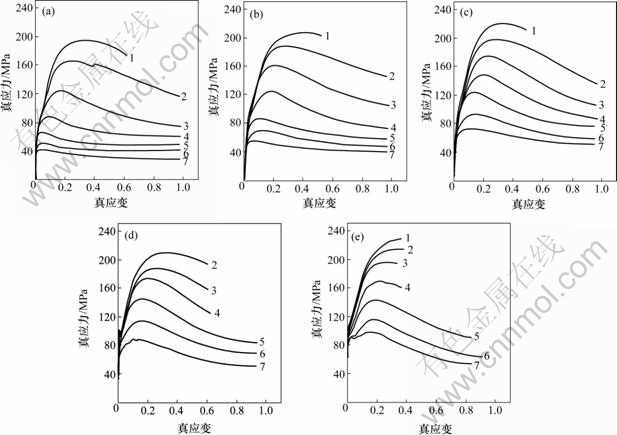 试样在不同变形条件下的真应力-应变曲线如图1所示。可见,峰值流变应力随着温度的升高而降低,随着应变速率的增大而增加,并且温度越高,应力越快达到峰值。温度是对流变应力影响最为明显的物理量,温度升高或降低直接引起应力升高或降低,在实际的高温变形过程中,绝大多数变形功转化成热能,直接影响其材料的塑性变形和相变、析出、动态回复及动态再结晶。当应变速率增加时,单位变形的时间缩短,动态再结晶提供的软化过程缩短,硬化过程相对加剧,合金的临界切应力增大,稳态流变应力也增大[11-12],在应变速率