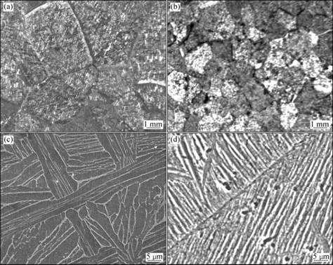 Fig.2 Typical grain ((a), (b)) and lamellar ((c), (d)) structures of centrifugally cast TC4 samples with different moduli (M): (a), (c) M=24.50 mm; (b), (d) M=3.00 mm