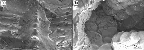 图2所示为典型凝固晶粒组织及α/β相变片层组织照片。由图2可看出,一般情况下,在Ti-6Al-4V合金凝固过程中,从β相到α相的固态相变会掩盖凝固树枝晶的组织形态。本研究中,在模数为24.50 mm(试样1)和26.00 mm(试样2)横浇道位置所取试样中含有中心集中缩孔,从孔洞中可观察到的树枝晶(见图3(a));在拉伸断口显微缩孔内壁观察到β-Ti的凝固枝晶组织(见图3(b))。