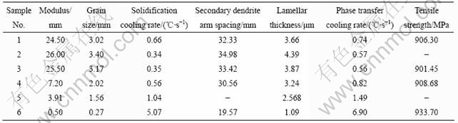 由以上实验结果可以看出,在陶瓷壳型(ZrO2- Y2O3)中离心浇铸TC4合金时,当铸件模数较小时,模数大小对铸件凝固过程冷速影响比较显著,而随着模数的进一步增加,铸件冷却速度随模数变化并不明显;铸件晶粒尺寸、二次枝晶间距和α/β相变片层厚度均随着铸件模数的增加而增加,而抗拉强度随铸件模数的增加明显降低。