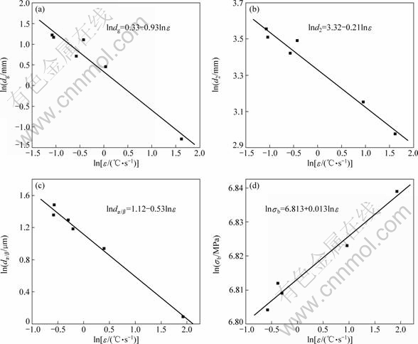 二次枝晶间距(d2)与铸件模数(M)和冷速(ε)之间的拟合关系式分别为