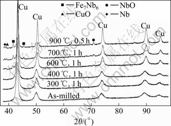 After heat treatment at different temperatures, the samples were taken out for X-ray powder diffraction analysis in order to trace the phase formation. Up to 400 ℃, there was no significant change of the powder diffraction pattern (Fig.1). With further increase of temperature, the fcc Bragg peaks became sharp gradually and recovery took place above 600 ℃. The fcc peaks moved towards higher angles, resulting from the precipitation of Nb from Cu matrix. A very small Nb peak was detected after annealing at 700 ℃ for 1 h. The intensity of the Nb peaks was enhanced at 900 ℃. High annealing temperatures led to the formation of CuO, NbO as well as Fe7Nb6.