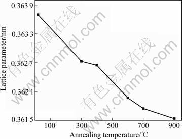 The process of phase change for Cu-10% Nb alloy is illustrated in Fig.2, which shows the lattice parameter of the Cu matrix as a function of annealing temperature. The lattice parameters were determined from the measured diffraction data using the DBWS Rietveld program[11]. The lattice parameter of the Cu matrix after milling is very large, which is caused by the fact that Nb is dissolved into the Cu matrix. As the temperature goes up, the lattice parameter decreases until the value nearly converges to that of pure copper (0.361 5[6]), which indicates the precipitation of Nb from Cu due to the larger atomic size of Nb. And almost all the Nb atoms precipitate from the solid solution after annealing at 900 ℃ for 0.5 h.