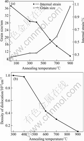 the lattice strain; Dhkl is the grain size[14]. As shown in Fig.3(b), the dislocation density keeps decreasing with the increase of temperature, and the dislocation density reduces to about 1×1011 cm-2 after annealing at 900 ℃ for 0.5 h, which indicates the occurrence of recovery. The decrease rates for both microstrain and dislocation density speed up above 400 ℃.