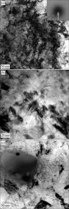 Fig.4 TEM images showing microstructures of mechanically alloyed nanocrystalline Cu-10%Nb alloy annealed at 400 ℃ for 1 h (a), 700 ℃ for 1 h (b) and 900 ℃ for 0.5 h (c) (Inset in (a) shows electron diffraction of (a)