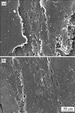 Fig.3 SEM morphologies of wear surface of composites A and B after test under 400 r/min, 40 N and 3 600 s