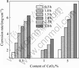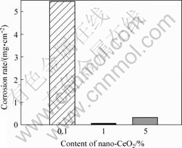 The corrosive results of the specimens on salt-spray condition are shown in Fig.1. It can be seen that, when the mass fraction of nano-CeO2 is 1% the corrosion resistance is the best. With further increase of nano-CeO2 to 5%, the corrosion resistance reduces.