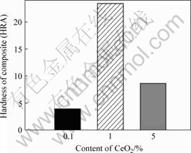 The Rockwell hardness of samples is shown in Fig.3. The hardness of the specimen with nano-CeO2 content of 0.1% is lower. When nano-CeO2 is increased to 1%, the hardness is the highest. With further increasing the content of nano-CeO2 to 5%, the hardness reduces.