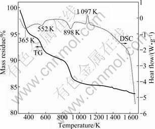 所用的红土镍矿来自印尼,含1.58% Ni和22.06% (质量分数) FeT,脉石成分主要包括19.5% MgO和35.6% SiO2。矿物组成为利蛇纹石(Mg3Si2(OH)4O5)、针铁矿(FeOOH)、赤铁矿(Fe2O3) 以及少量石英(SiO2),属于腐泥土型红土镍矿。化学物相分析结果(见表1)表明:原矿中的镍不以独立矿物存在,主要分布于铁氧化物和硅酸盐矿物中,其分布率分别为66.0%和28.3%。从TG-DSC曲线(见图1)可知,原矿中的利蛇纹石在898 K左右脱除羟基生成无定形的硅酸盐,而无定形的硅酸盐在1 097 K左右重结晶生成镁橄榄石(Mg2SiO4)和顽火辉石(MgSiO3)[11-12]。稳定、致密的镁橄榄石和顽火辉石的生成,不利于赋存于其晶格中的镍的还原[13]。
