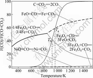 图2 固体碳还原铁、镍氧化物的平衡气相组成与温度的关系