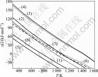 图3 反应式(1)~(8)的?GΘ—T关系曲线