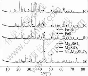 采用X射线衍射技术研究硫酸钠和碳酸钠作用下红土镍矿还原产物的物相组成,其结果分别如图4和5所示。还原焙烧条件为焙烧温度1 100 ℃,焙烧时间60 min。