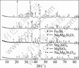 1) 当还原温度低于1 100 ℃时,碳酸钠可与硅酸盐矿物镁橄榄石(Mg2SiO4)、顽火辉石(MgSiO3)反应生成Na2Mg2Si2O7和Na4Mg2Si3O10,而硫酸钠只能与MgSiO3发生反应。因此,碳酸钠对破坏硅酸盐矿物的结构和促进赋存于蛇纹石中镍的还原作用更大。