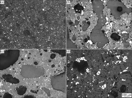 Fig. 6 Microstructures of reduced pellets with addition of different sodium salts: (a) Without additive; (b) 10% Na2SO4; (c) 10% Na2CO3; (d) 10% Na2SO4+10% Na2CO3