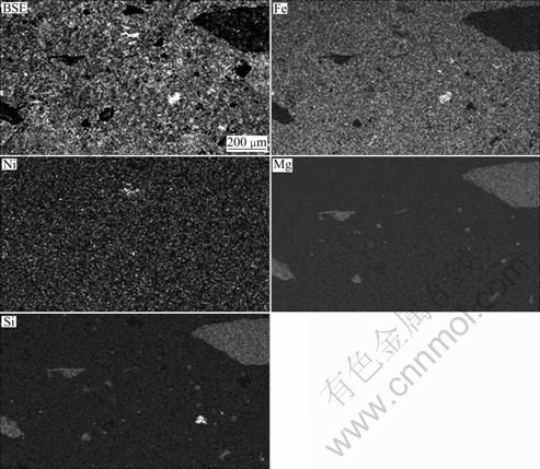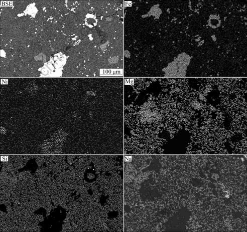 3) 在硫酸钠和碳酸钠共同作用下,还原产物中镍铁颗粒的尺寸较无钠盐作用时明显增大,部分镍铁颗粒的粒度达到50 μm以上;镍、铁元素分布集中且区域基本一致,与脉石成分的分布区域界限分明,为通过磁选方法有效分离镁和硅等非磁性脉石成分,为获得高镍品位的磁性产品及高的镍回收率提供了有利的 条件。