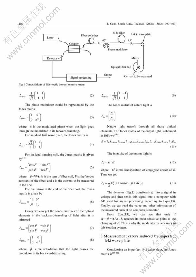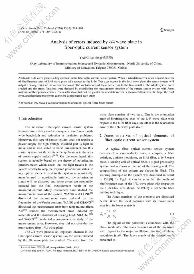 Abstract: 1/4λ wave plate is a key element in the fiber-optic current sensor system. When a retardation error or an orientation error of birefringence axes of 1/4λ wave plate with respect to the hi-bi fiber axes occurs in the 1/4λ wave plate, the sensor system will output a wrong result of the measured current. The contributions of these two errors to the final result of the whole system were studied and the errors functions were deduced by establishing the measurement function of the current sensor system with Jones matrixes of the optical elements. The results show that that the greater the orientation error or the retardation error, the larger the final error, and that these two errors cannot be compensated each other.
