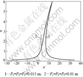 图6中,其余各参数取值如下:k1=20.5 N/m,k2= -3 063 N/m2,k3=21 279 N/m3,F1=F2=F3=0.015 m,从图6可知,当载荷变小时,这种组合共振的幅频曲线弯曲程度变大,非线性现象变得更明显。