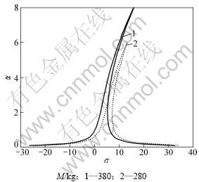 从图2可以看出:与一般弹簧的特性不同,空气弹簧的绝对弹力总是正值。但相对平衡位置,弹力可以有正有负:在平衡位置以上为负,在平衡位置以下为正。相对于平衡位置75 mm高度时的相对载荷如图3所示。