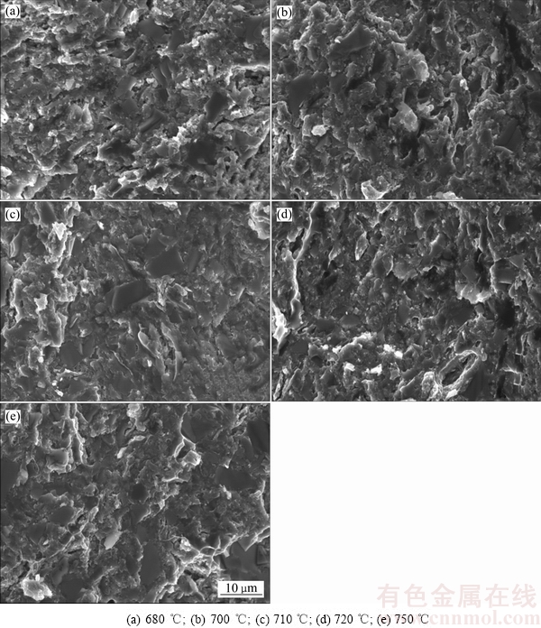 Fig. 6 SEM images showing fractographs of 50%SiCp/6061Al composites sintered at different temperatures