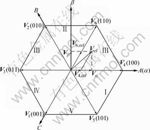 以参考空间电压矢量Vref处于第Ⅲ扇区(0~60?)为例,为了使Vref的相邻矢量V4和V6的合成矢量等效于Vref,则须有