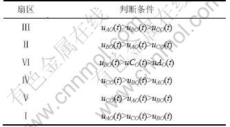 因以上过程是可逆的,所以当三相电压满足式(7)时,其对应的空间电压矢量必处于第III扇区。同样方法可求得其他扇区的判断条件,如表1所示。