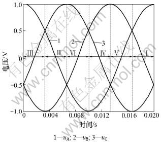 注意到uref与uAO(t)之间的相位关系,可以得到参考空间电压矢量所在扇区与三相相电压瞬时值之间的对应关系,如图3所示。由图3可以很容易看出扇区的判断条件与表1所列的一致。