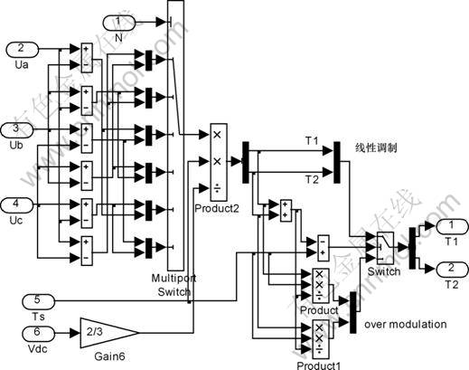 根据上述方法建立相邻矢量作用时间求取的Simulink仿真模型如图5所示。由图5可看出,该方法只要进行简单的四则运算,无需任何三角函数和坐标变换运算。