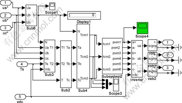 为验证本文所提出算法的正确性,构建了基于改进SVPWM算法的永磁同步电机矢量控制系统,仿真模型如图6所示。其中SVPWM子模块的仿真模型如图7所示。