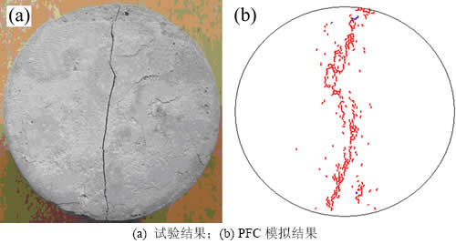 图1所示为采用表1所示细观参数模拟获得的完整圆盘试样巴西试验最终破裂模式试验结果与室内试验结果对比。从图1可见:PFC模拟获得的破裂模式试验结果与试验结果相吻合,这表明采用颗粒流程序以及该组细观参数(表1)可以再现圆盘试样巴西试验。在此基础上,进行后续中心直切槽圆盘试样颗粒尺寸效应分析。