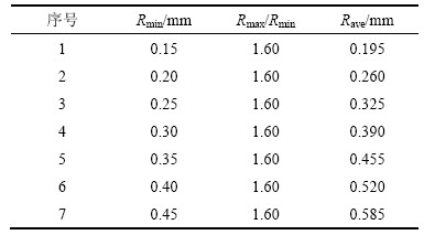 为研究颗粒尺寸对中心直切槽圆盘强度和裂纹扩展特征的影响,设计模拟方案,如表2所示。表2中:Rmin为颗粒最小半径;Rmax/Rmin为颗粒最大半径与最小半径的比值;Rave为颗粒平均半径。