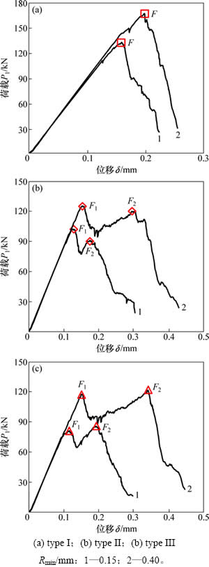 对比图3(a),3(b)和3(c),荷载-位移曲线可以分为典型的3类:type I,为单峰值曲线,其特征在于曲线仅有1个明显的峰值荷载F,如图3(a)所示;type II,为峰值之后软化曲线,其特征在于曲线有2个明显的峰值荷载F1和F2,且F2小于F1,如图3(b)所示;type III,为峰值后强化曲线,其特征在于曲线有2个明显的峰值荷载F1和F2,且F2大于F1,如图3(c)所示。表3所示为中心直切槽圆盘试样荷载-位移曲线类型。