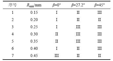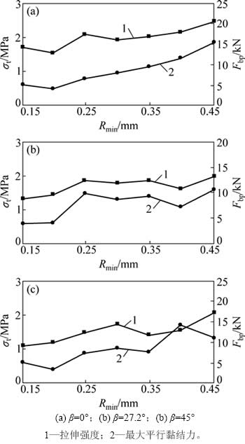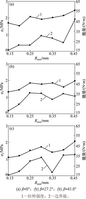 从表4可见:当倾角β为0°时,拉伸强度分布在1.540 MPa(Rmin=0.20 mm)~2.477 MPa(Rmin=0.45 mm)之间,最小强度衰减因子为32.30%(Rmin=0.30 mm),最大强度衰减因子为47.46%(Rmin=0.20 mm);当倾角β为27.2°时,强度分布在1.308 MPa(Rmin=0.15 mm) ~1.970 MPa(Rmin=0.45 mm)之间,最小强度衰减因子为37.53%(Rmin=0.30 mm),最大强度衰减因子为54.46% (Rmin=0.15 mm);当倾角β为45°时,强度分布在1.104 MPa(Rmin=0.15 mm)~2.058 MPa (Rmin=0.45 mm )之间,最小强度衰减因子为38.89%(Rmin=0.30 mm),最大强度衰减因子为61.56%(Rmin=0.15 mm)。