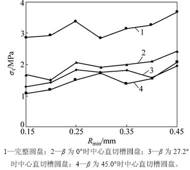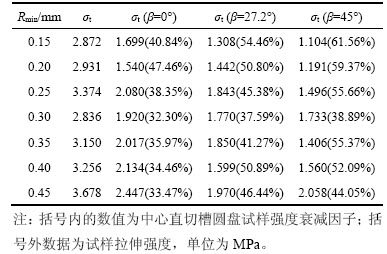 中心直切槽圆盘强度也采用式(5)计算,但该值并非其真实拉伸强度,本文仅将其用于比较。强度衰减因子δ由下式计算: