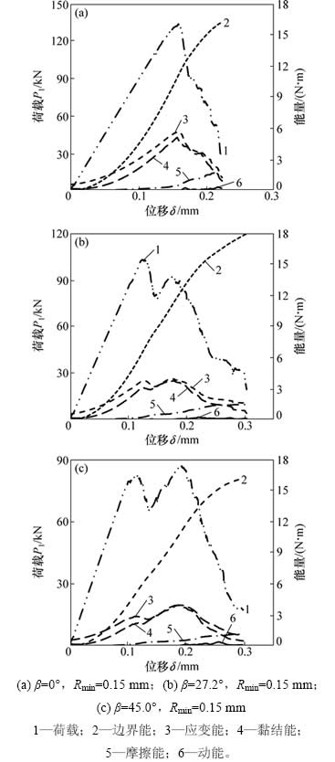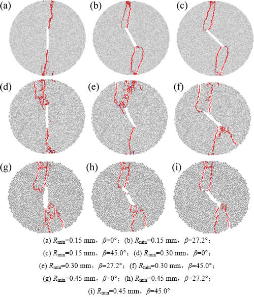 图5所示为颗粒最小半径对中心直切槽圆盘最终破裂模式的影响,仅以颗粒最小半径为0.15,0.30和和0.45 mm为例说明,分别如图5(a),5(b)和5(c)所示。从图5(a)可见:当颗粒最小半径为0.15 mm,倾角β为0°时,中心直切槽圆盘试样主要发生轴向劈裂破坏,最终破裂为两半,是由切槽两端起裂的2条拉伸裂纹造成的;当倾角β为27.2°时,试样内除了2条从裂隙尖端萌生的翼形裂纹外,还有2条由试样端部萌生的次生裂纹;当倾角β为45°时,破裂模式与倾角β为27.2°试样相似,由翼形裂纹和次生裂纹共同作用导致破坏。从图5(b)可见:当颗粒最小半径增大为0.30 mm,倾角β为0°时,中心直切槽圆盘试样除了裂隙尖端萌生的主裂纹外,还有1条次生裂纹;而当倾角β为27.2°时,试样内有2条翼形裂纹和1条次生裂纹;倾角β为45°试样是由2条翼形裂纹和2条次生裂纹作用造成试样破裂。需特别注意的是:上部翼形裂纹并非萌生于切槽尖端而是萌生于距切槽尖端一定距离处。从图5(c)可见:当颗粒最小半径增大为0.45 mm,倾角β为0°时,中心直切槽圆盘试样含有2条切槽尖端萌生的主裂纹和3条试样端部萌生的次生裂纹,切槽下尖端萌生的主裂纹并未扩展至试样的边缘;倾角β为27.2°和45.0°中心直切槽圆盘试样破裂模式相似,均为翼形裂纹和次生裂纹共同作用导致试样破裂。对比图5(a),5(b)和5(c)可知:颗粒最小半径对中心直切槽圆盘试样的破裂模式均有较大的影响,且当颗粒最小半径相同时,颗粒最小半径主要影响中心直切槽圆盘中次生裂纹的萌生和扩展。