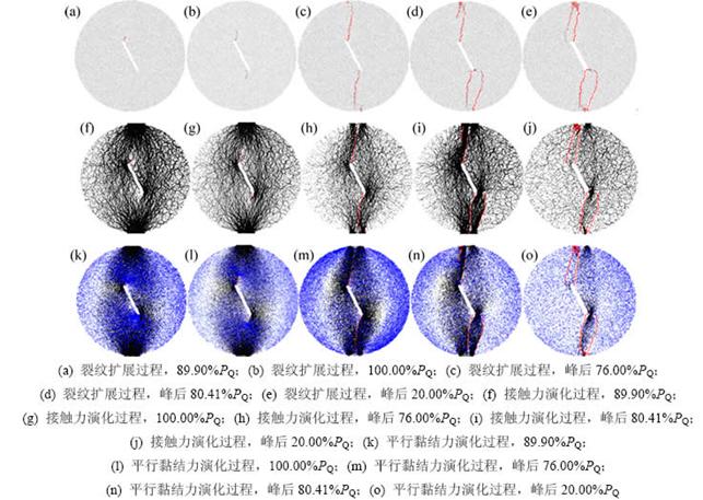 为分析中心直切槽圆盘试样裂纹萌生及扩展过程以及对应阶段试样内部细观力场的演化规律,对巴西试验模拟过程进行裂纹及细观力场跟踪监测。
