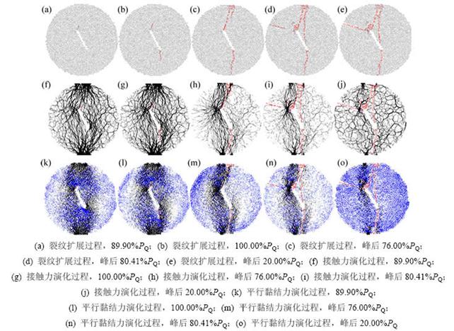 当最小半径为0.40 mm,切槽倾角为27.2°圆盘试样裂纹扩展过程及相应的接触力、平行黏结力场演化如图7所示。从图7可见:对于切槽倾角β为27.2°圆盘试样,当荷载为120.0 kN(95.93%PQ)时,首先在切槽上尖端萌生初始裂纹,接着在切槽下尖端产生裂纹(对应荷载水平为劈裂荷载125.61 kN);翼形裂纹扩展路径逐渐平行于加载方向;当荷载到达113.92 kN(峰后90.69%PQ)时,在试样上端部萌生次生裂纹,次生裂纹逐渐扩展至切槽下尖端;当荷载水平为105.74 kN(峰后84.18%PQ)时,在试样的左上边缘产生第2条次生裂纹,并扩展至切槽上尖端。在裂纹扩展过程中接触力和平行黏结力的演化与图6的类似。
