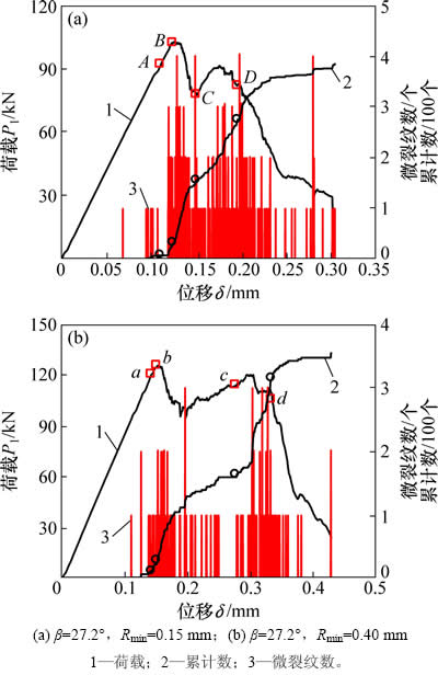为揭示中心直切槽圆盘试样裂纹扩展过程中微裂纹发育特征,在模拟过程中对微裂纹数目进行统计,以期建立裂纹扩展过程微裂纹与宏观裂纹扩展之间的关系。图9所示为中心直切槽圆盘裂纹扩展过程中微裂纹发育情况,其中,图9(a)和9(b)中标注的裂纹产生顺序分别见图6和图7。从图9可见:在加载初期,试样内基本无微裂纹产生;当加载至一定荷载后,试样内才开始逐渐有微裂纹萌生。根据荷载-位移-微裂纹曲线之间的关系可知:当荷载曲线发生1个较显著的跌落,对应1次较显著的微裂纹数目,在微裂纹累计曲线上相应产生1次陡增现象,这意味着试样内快速产生了较多的微裂纹。另外,观察宏观裂纹与微裂纹增长速率之间的关系可知,当试样中产生1条显著的宏观裂纹时对应的微裂纹增长速率明显较大。需要注意到的是:图9(a)中产生裂纹1时对应的微裂纹增长速率近似为0。这是因为标注的裂纹1为一定数量的微裂纹聚合在一起形成的肉眼可见的宏观裂纹(见图6(a)),标注时间稍滞后于其真正萌生时间。