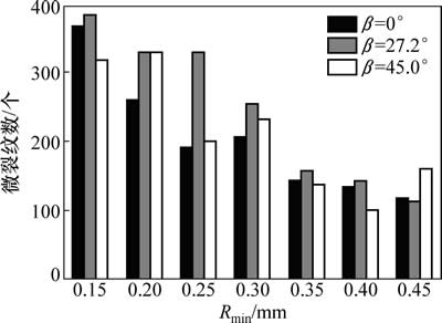 图10所示为中心直切槽圆盘试样最终破裂时微裂纹总数柱状图,以探究微裂纹总数与颗粒尺寸之间的关系。从图10可见:当切槽倾角β为0°和27.2°时,裂纹总数总体上随着颗粒尺寸的增大呈减小趋势;而当切槽倾角β为45°时,微裂纹总数与颗粒最小半径之间无明显关系。此外,微裂纹总数虽然有一定的差异,但总体上还保持在1个数量级内(100~400之间)。由此可见:在本次模拟范围内,颗粒最小半径变化时对破裂程度不会产生非常明显的改变。