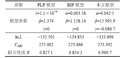 ,表明该数控机床已进入耗损阶段,因此,可以采用BIP模型或本文模型对其可靠性进行评估。不同模型计算结果如表1所示。由表1可以看出:基于最小维修假设的PLP模型和BIP模型,维修影响系数