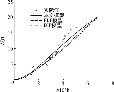 为期望故障数的估计值。R越大则说明模型拟合程度越好。不同模型的拟合优度计算结果如表1所示。从表1可以看出:本文模型的拟合优度评价指标R最大,进一步说明本文模型即为最佳模型。不同模型的累积故障数拟合曲线如图1所示,从图1可以看出:本文提出的连续比例强度模型更适合描述其故障趋势。