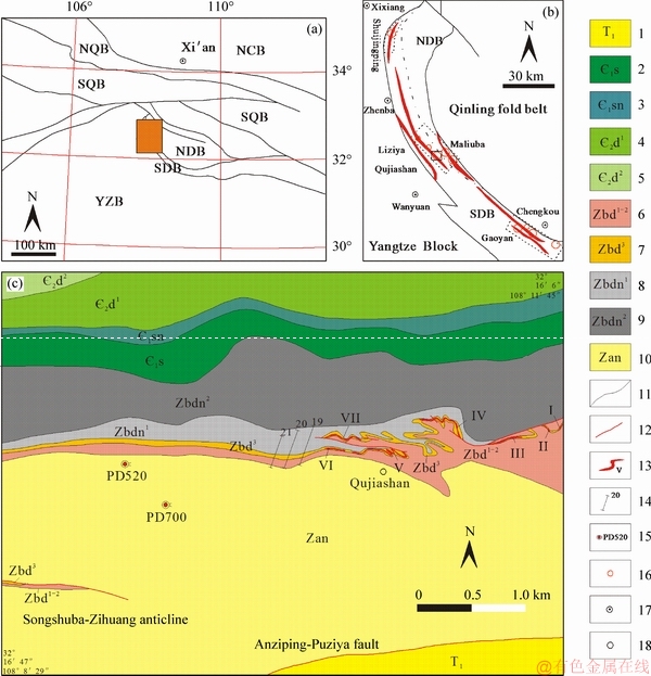 Figure 1 (a) Tectonic map of Qinling orogenic belt (modified from Ref. [4]); (b) Regional tectonic map of northern margin of Yangtze Block; (c) Geological map of Qujiashan manganese deposit. NCB—North China Block; NQB—North Qinling Belt; SQB—South Qinling Belt; NDB—Northern Daba Mountains thrust-nappe Belt; SDB—Southern Daba Mountains foreland fold-thrust Belt; YZB—Yangtze Block. 1—Lower Triassic; 2—Cambrian, Shipai Fm; 3—Cambrian, Shilongdong Fm; 4—Cambrian, section I of Dazhaigou Fm; 5—Cambrian, section II of Dazhaigou Fm; 6—Section I-II of Doushantuo Fm; 7—Section III of Doushantuo Fm; 8—Section I of Doushantuo Fm; 9—Section II of Doushantuo Fm; 10—Nantuo Fm; 11—Geoline; 12—Fault; 13—Orebody and number; 14—Line of exploration section; 15—Location and number of cave; 16—Manganese deposit; 17—City; 18—Town