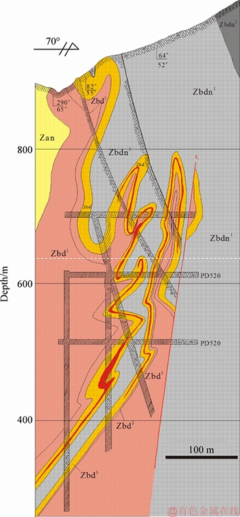 The study area is located in the northeastern limb of the Songshuba-zihuang anticline (Figure 1(c)), which is a northwest trending overturned anticline. Manganese-bearing rocks have experienced strong deformation due to a series of strong squeezing isoclinal and plunging folds (Figure 2). Sinian to Triassic strata is mainly exposed in the mine (Figure 1(c)). The Sinian Dengying Formation (Zbdn) is subdivided into two sections: 1) the upper section consists of grey massive dolomite with a thickness of more than 100 m; 2) the lower section consists of grey siliceous-bearing limestone, marl and shale, with a thickness of 50-60 m. The lower section has a conformable contact with the underlying strata.