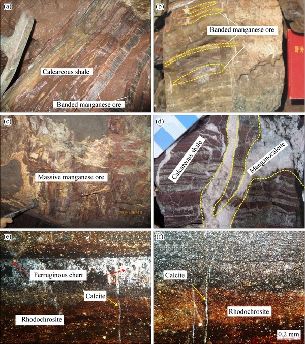 Qujiashan deposit has simple ore mineral assemblages that consist of psilomelane, pyrolusite, braunite, rhodochrosite and manganocalcite, and gangue minerals include calcite, quartz, feldspar, chlorite, antigorite and barite. The large variety of ore textures present in the Qujiashan deposit. The most important textures include the following features. Banded texture consists of rhythmically banded ore containing distinct generations of rhodochrosite or gangue mineral of calcite, braunite, hydromuscovite, kaolinite and chert. The widths of bandeds range from a few millimeters to a dozen centimeters (Figure 4(a)). Rhodochrosite occurs as densely disseminated in argillaceous minerals (Figure 4(e)). Irregularly banded and lenticular texture consists of discontinuous or lentoid rhodochrosite vein. It mainly appears at the edge of the ore bodies or near the upper and lower wall rock (Figure 4(b)). Volcanic rock is often observed in the contact area between rhodochrosite and surrounding rock (Figure 4(f)). Massive texture formed when width of the rhodochrosite banded is larger than 20 cm. The Mn grade of ore is generally higher than 25% (Figure 4(c)). And Mn-bearing calcite vein filled in fissure of the manganese- bearing rocks (Figure 4(d)).