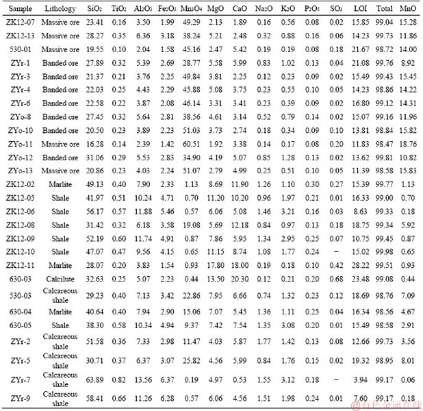 Table 1 Major element compositions of ores and wall rocks in Qujiashan manganese deposit (mass fraction, %)