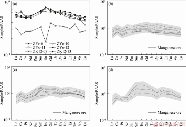 Figure 5 PAAS-normalized REEs patterns of ores from (a) Qujiashan (modified from Ref. [10]), (b) Xiangtan [11],(c) Xixibao [12] and (d) Gaozeng [13] deposits